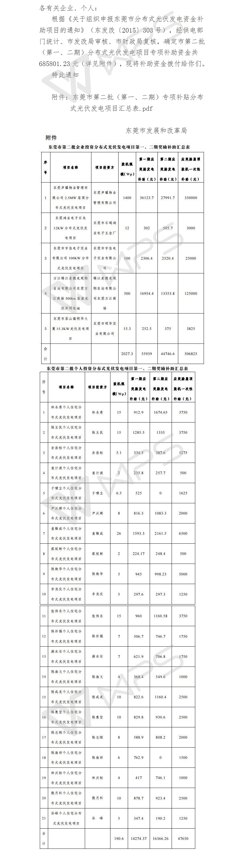 关于拨付东莞市第二批(第一、二期)分布式光伏发电项目专项补助资金的通知